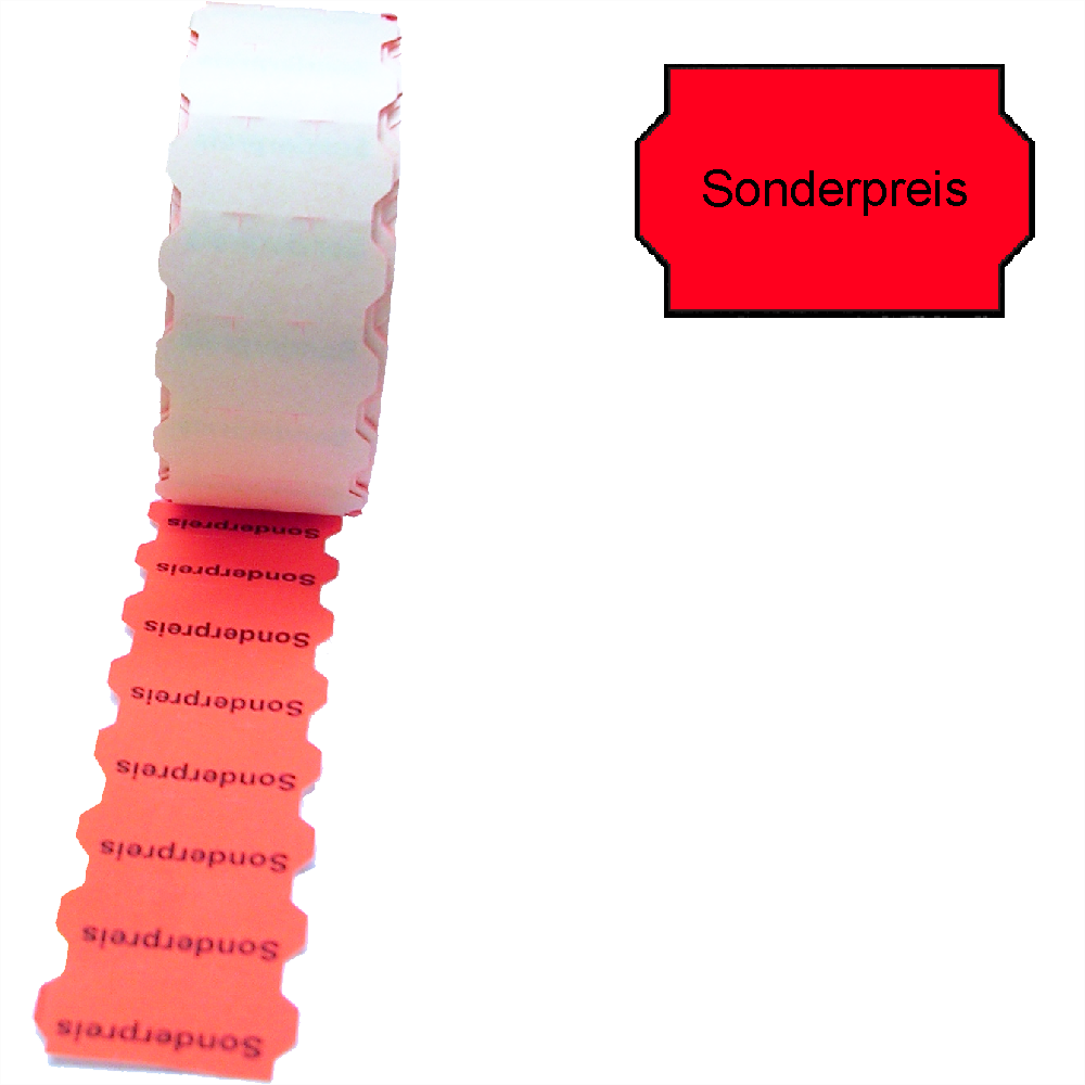 - Wellenrandetiketten in neonrot mit Aufdruck "Sonderpreis" - Rolle á 1.112 Stück Etiketten - mit Schlitzstanzung - Klebung Standard für viele gängigen Preisauszeichner: Top2000, SYSTAK, meto, contact, Tovel, Prix, SP1, Blitz.... - Lieferzeit sofort ab/am Lager Durach - Lagerware Suchen Sie einen bestimmten Artikel? Wünschen Sie ein unverbindliches Angebot? Fragen Sie bei uns an.
